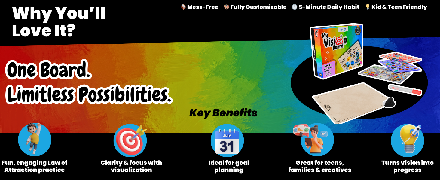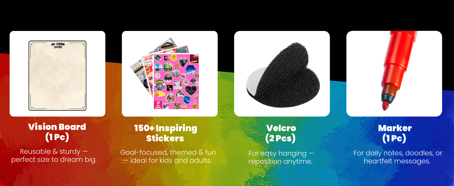 From dream-filled kids to goal-driven teens to ambitious adults, anyone can use this kit to clarify their vision and make it tangible. It’s ideal for anyone looking to boost positivity, improve focus, and attract success through the power of visualization.