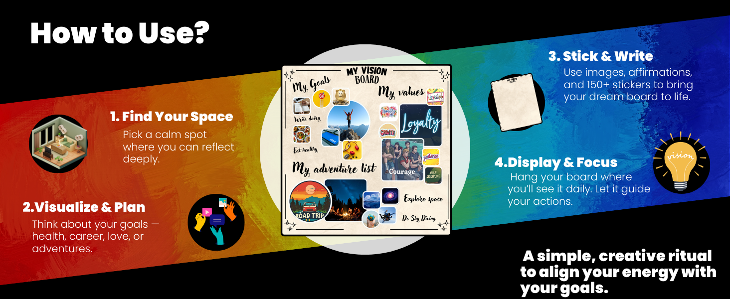 Whether it’s a solo reflection session, a family project, a classroom activity, or a vision board party, this kit turns goal-setting into an inspiring group experience. It’s also perfect for workshops, self-development retreats, and personal motivation corners.