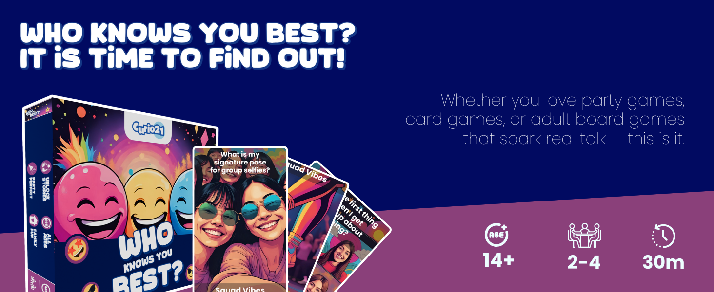 With easy-to-learn rules and endless replayability, Curio21 Who Knows You Best? is suitable for kids, teens, and adults alike. No two rounds are ever the same, so you can play it again and again without it ever getting old. It’s the perfect board game gift for anyone who loves fun challenges, witty banter, and genuine connection.