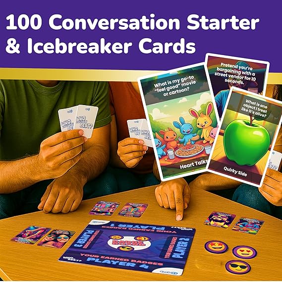 Inside the box, you’ll find 100 scenario cards packed with creative and thought-provoking questions designed to spark lively conversations and friendly debates. Each round offers something new, ensuring no two games ever feel the same. The set also includes 12 player badges so you can easily track scores, adding a competitive twist to the fun. To make gameplay visually engaging, a badge board is included, letting players proudly display their progress. And for an extra dash of excitement, you’ll find bonus challenge cards — surprise twists that keep everyone guessing and on their toes until the very last moment.