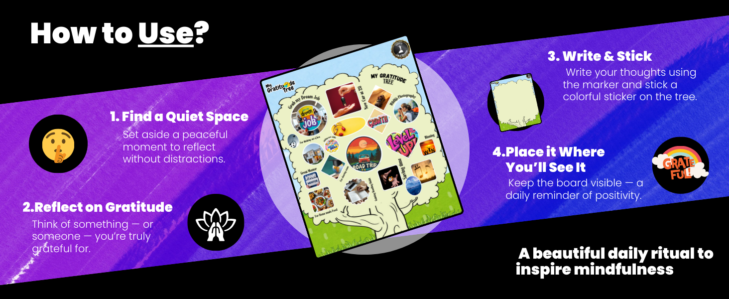 Find a quiet spot and think about all the things you are thankful for big or small. Reflect, write your thoughts on a leaf sticker using the marker, and place it on the tree. Watch it bloom with positivity every day. Whether you start or end your day with it, this board becomes a powerful visual reminder of gratitude in action.