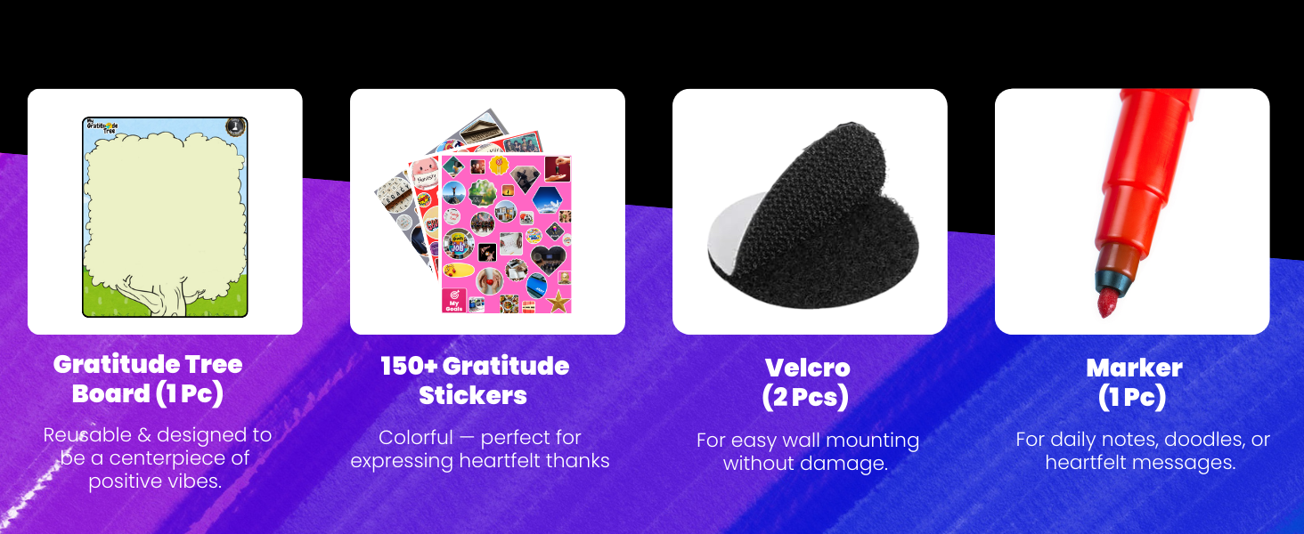 This complete gratitude tree set includes 1 gratitude tree board, over 150 colorful gratitude stickers to capture daily moments of thankfulness, 2 Velcro dots for easy wall mounting, and 1 marker for writing your personal notes — everything you need to start your gratitude journey right out of the box.