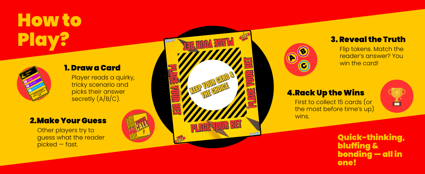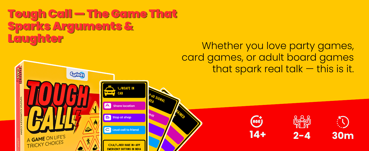 Life often throws you into unexpected and tricky situations — and Curio21 Tough Call turns those moments into a hilarious, fast-paced challenge! This fun party game puts your decision-making skills to the test as you face quirky, unpredictable, and sometimes downright absurd scenarios. The twist? You have to think on your feet, make your quick, witty decisions, and see if others can guess your choice.