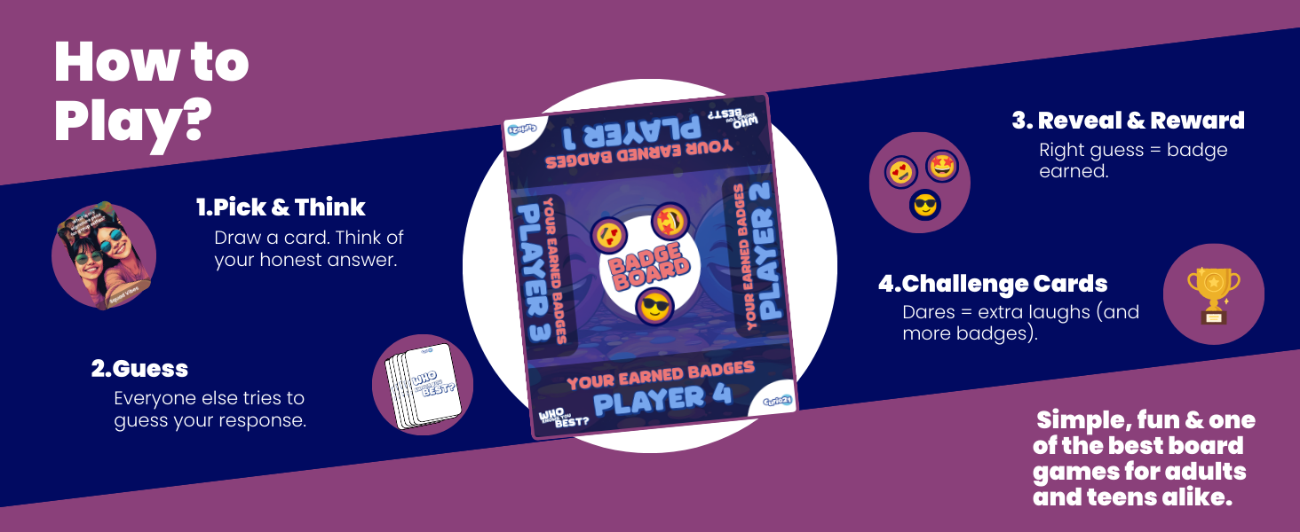 Designed for 2–4 players, the game is ideal for teens, adults, and mixed-age groups looking for a quick, interactive experience. Whether you’re playing with close friends or meeting new people, it’s the kind of game that brings everyone together.